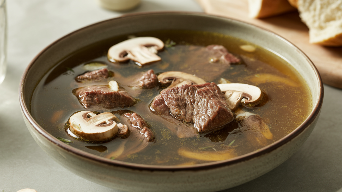 The flavor relies on the depth of the rich bone broth combined with the natural umami of the mushrooms and seared beef. Without traditional thickeners like flour or starch, the soup remains light and savory while highlighting the quality of the protein and stock. Simple seasonings of salt and black pepper are used to balance the earthy notes of the garlic and dried herbs.
