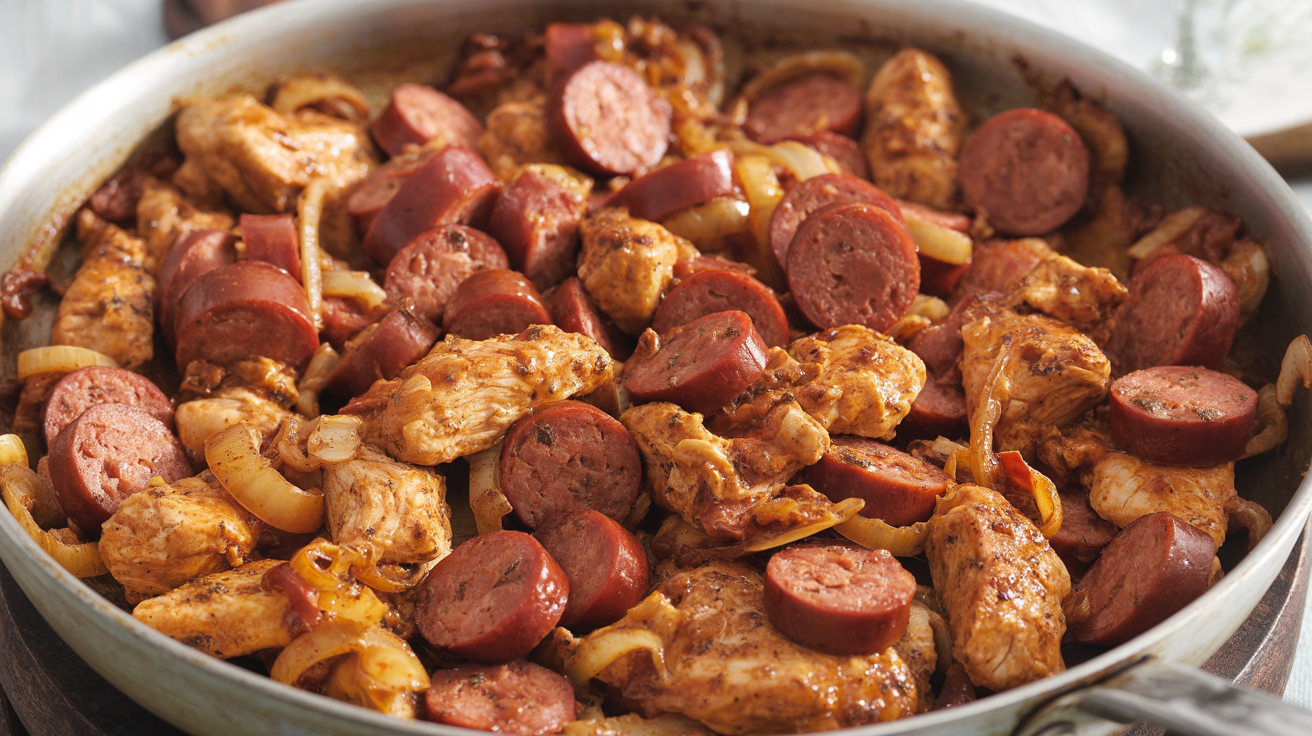 The chicken is seared first to develop flavor and lock in moisture, while the sausage adds richness and depth. Onion and bell pepper bring balance and texture, absorbing the Cajun spices as everything cooks together in the skillet. The result is a savory, slightly spicy dish with layers of flavor in every bite.