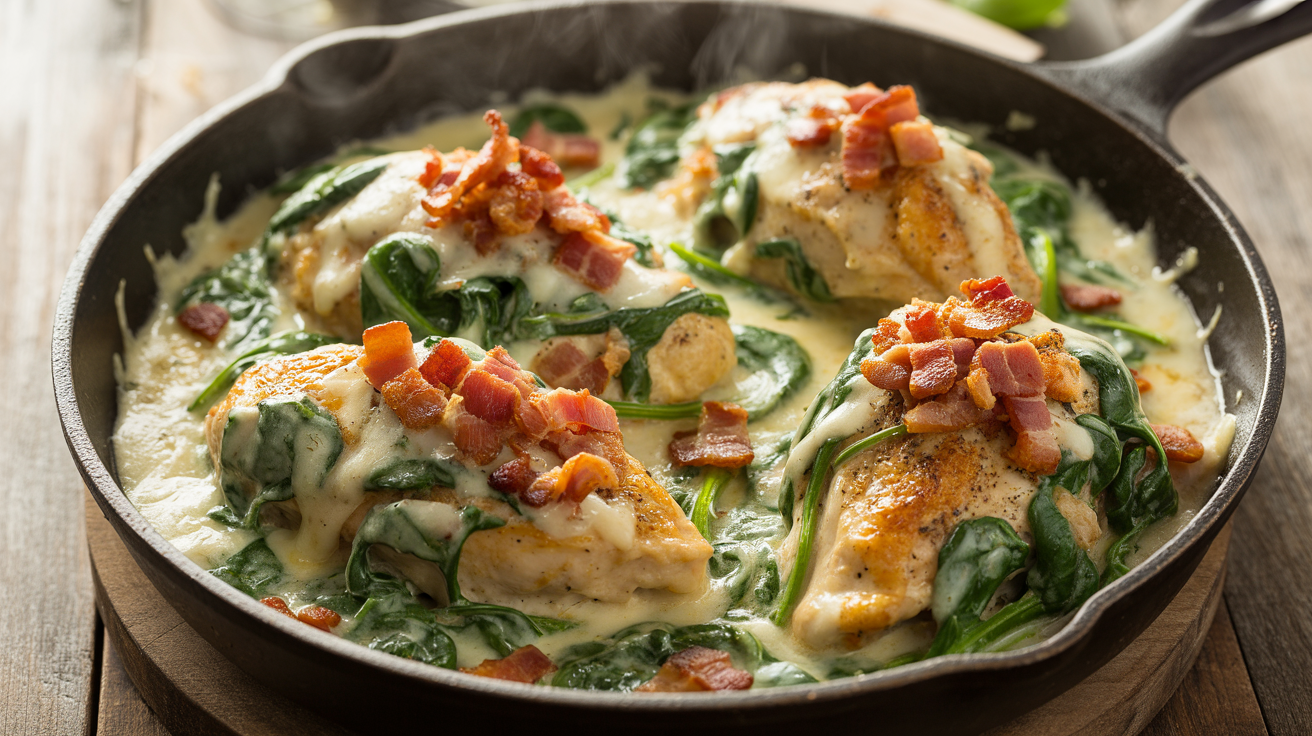 Crispy bacon and fresh, vibrant spinach are folded into a rich cheese sauce to create this one-pan chicken dinner. The dish utilizes heavy cream, mozzarella, and Parmesan to achieve a thick, velvety consistency that coats the seared protein without the need for traditional thickeners. With its smoky aroma and savory profile, the skillet offers a comforting meal that moves directly from stovetop to table.