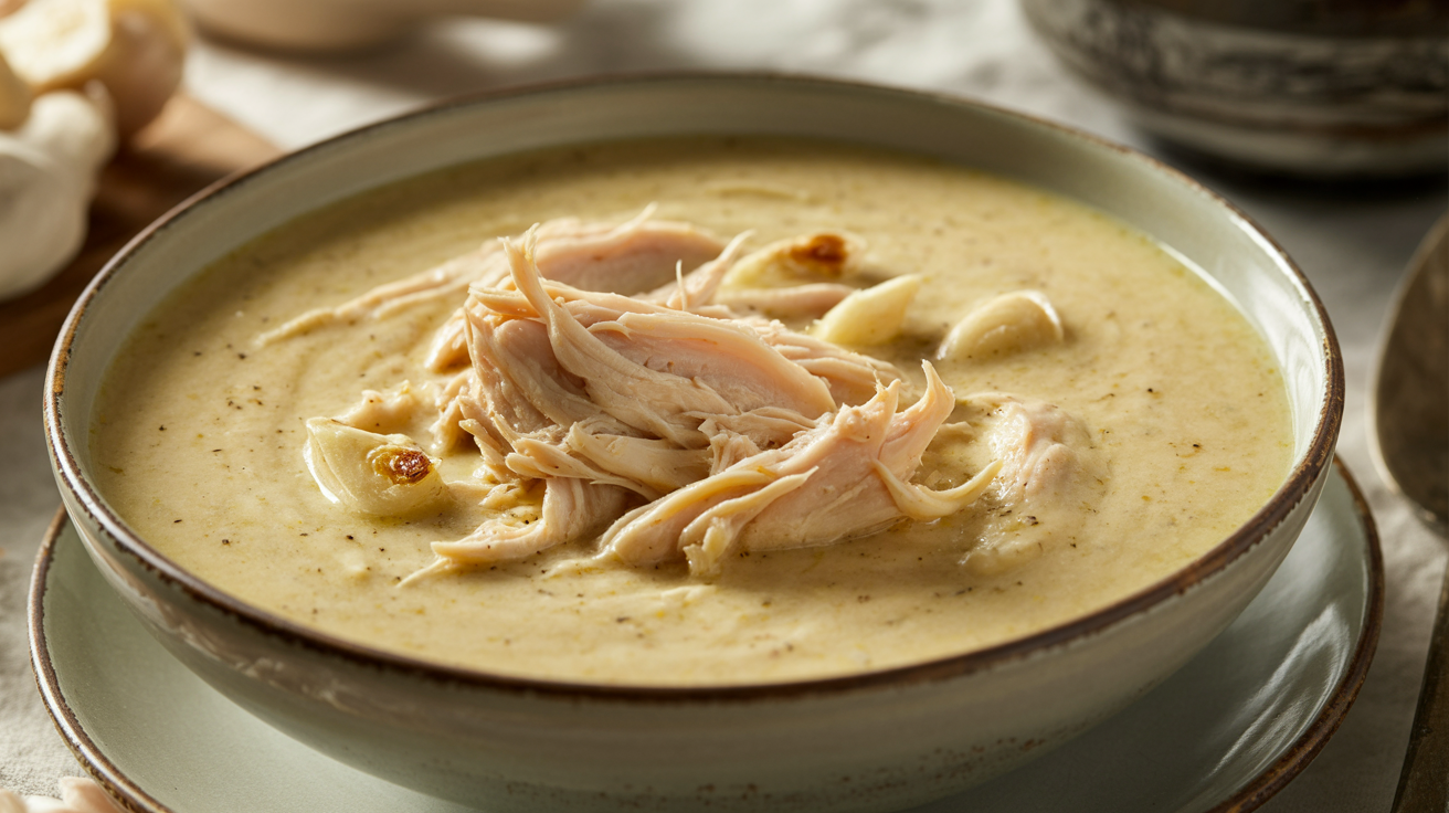 This rich soup features tender shredded chicken in a base of chicken broth and heavy cream infused with whole roasted garlic. The chicken is simmered until tender while the garlic heads are roasted separately to achieve a mellow, softened flavor profile before being incorporated into the liquid. This recipe uses simple ingredients to create a creamy, savory bowl as a sugar-free soup.