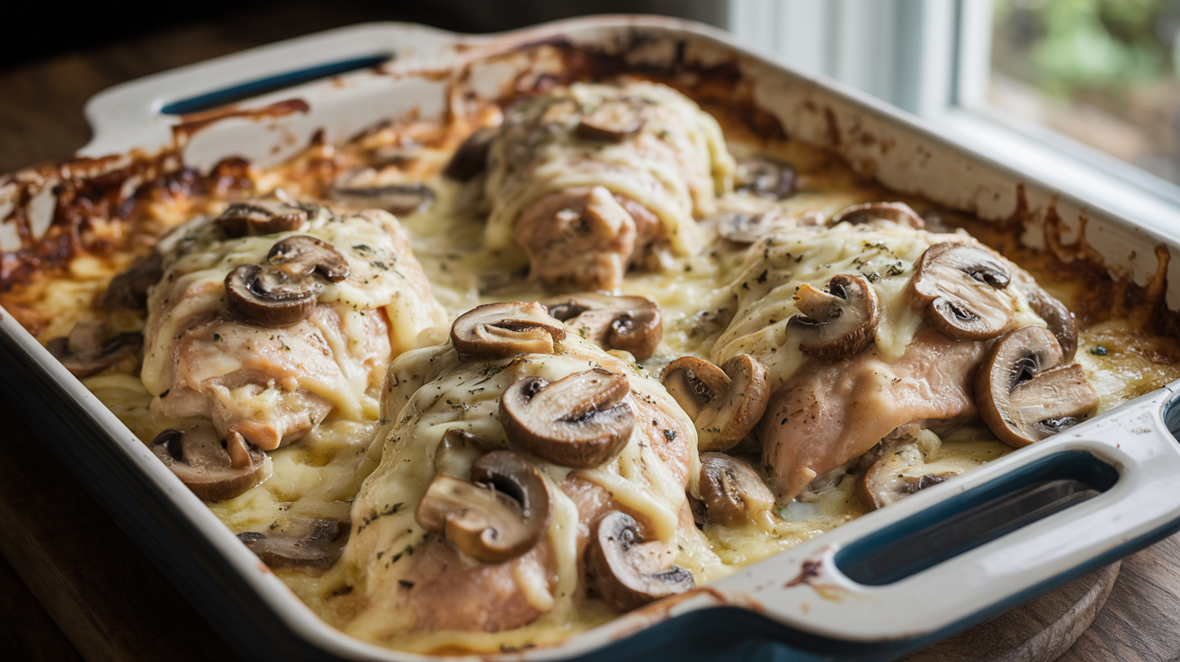 This oven-baked casserole features tender chicken thighs topped with a savory layer of sautéed mushrooms and minced garlic in a thick, velvety cream sauce. Finished with a blend of melted mozzarella and Parmesan, the dish develops a golden, bubbling surface that contrasts with the earthy, umami-rich flavors of the mushrooms. It is a hearty and aromatic meal that highlights the classic combination of garlic, thyme, and cream.