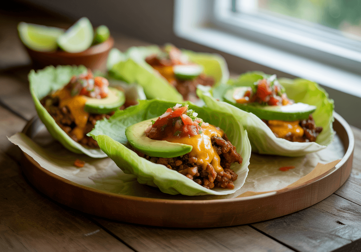 These tacos start with seasoned ground beef cooked with garlic, onion, and classic Mexican-inspired spices like cumin, paprika, and chili powder. The flavor is bold and savory, just like traditional taco filling. Instead of flour or corn tortillas, sturdy lettuce leaves (like romaine or iceberg) step in as the βwrap.β Theyβre crunchy, refreshing, and the perfect vessel for loading up with toppings.